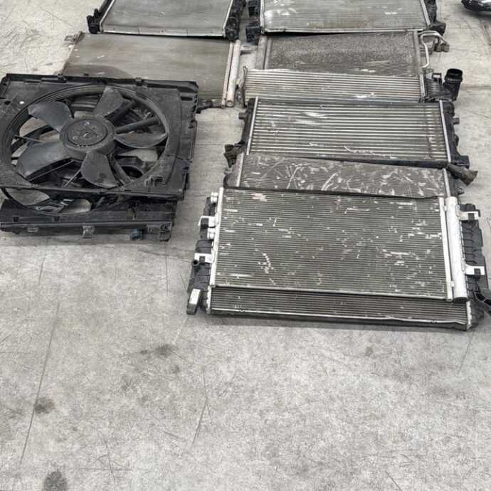 Descripción: Conjunto de radiadores y componentes de módulo de enfriamiento (radiadores de motor, posibles condensadores A/C y ensamble de ventilador con shroud) usados. Pueden presentar golpes, aletas dobladas, fugas, soldaduras previas y suciedad por uso/almacenaje.
